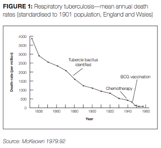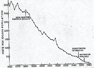 McKeown attributes most of the reduction in the death rate (and increase in longevity) from the beginning of the 18th century to the 1970s to the decline in infections. The decline in death from tuberculosis alone (the biggest killer in the mid 1800s) was associated with nearly half of the decline in the overall death rate during the second half of the nineteenth century. The death rate from tuberculosis continued to decline in the early 20th century and was at very low levels by the time the first effective medical treatment (streptomycin) arrived (see image below, and I have placed comparative US data below it). He uses such data to conclude that modern medicine was not the big player in the decline of tuberculosis. Looking at the graphs it seems obvious, but if you ask any first year medical student (or final year, or doctor?) they will tell you that the invention of antibiotics was responsible for the control of tuberculosis.